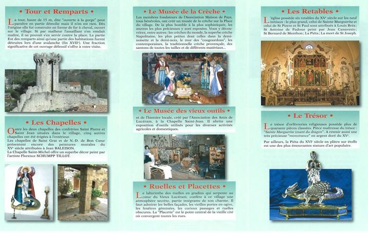 Lucéram, puisqu’il s’agit de ce vieux village, attire des milliers d’amateurs d’art. Il est très fier de leur présenter ses retables et ses fresques du XVème siècle ainsi que son trésor d’orfèvreries religieuses. Sa Pastorale des bergers et la messe de minuit sont très connues, surtout depuis que la télévision en a transmis en direct le déroulement en 1967. Il y a de nombreuses années que, Christiane Ricort, la Présidente de la Maison de Pays, présente dans la chapelle Saint-Pierre, une crèche provençale.