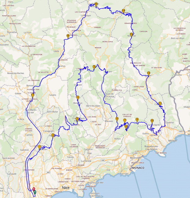 Notre trajet aller vers Saint Agnès nous fera passer par Colomars, Castagniers, Aspremont, Châteauneuf Villevieille, Bendejun, Coaraze, le col Saint-Roch, Lucéram, L’Escarène et Peille