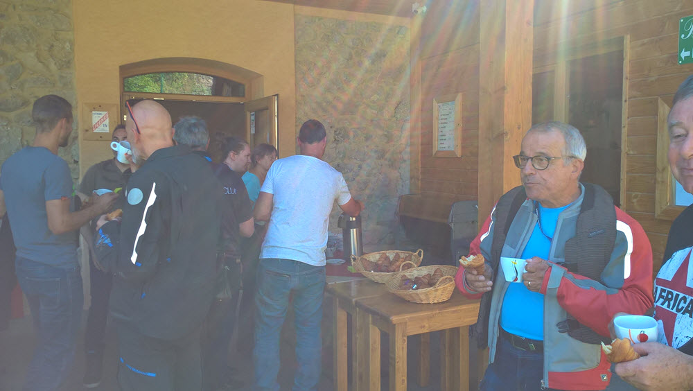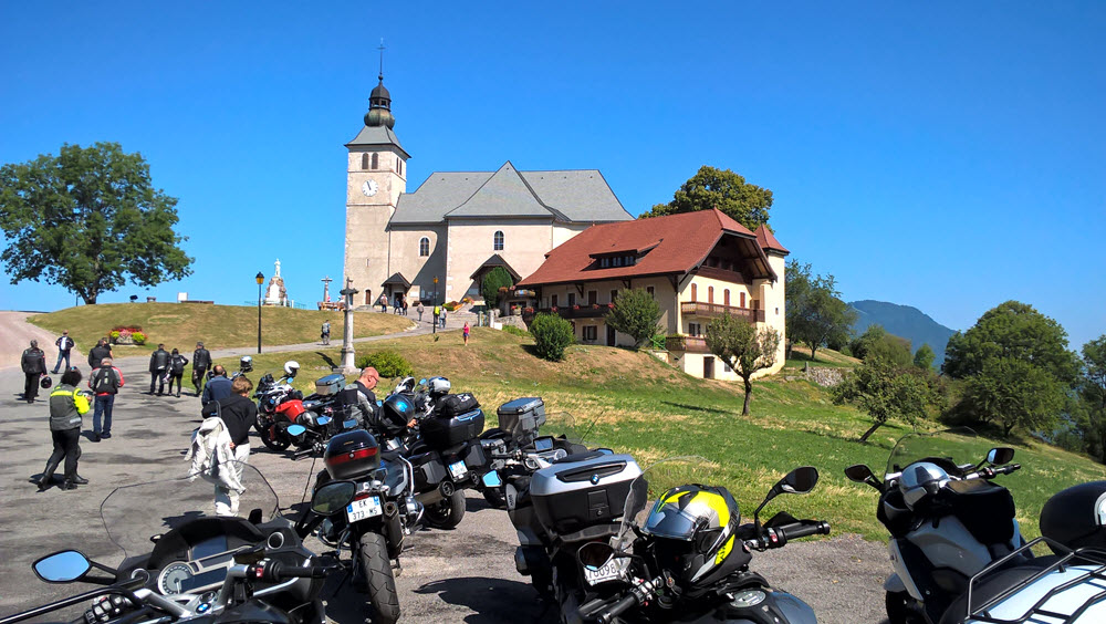 Toujours par des itinéraires bucoliques nous arrivons dans la vallée de l’Arve, et première réjouissance par la route, parfois escarpée, qui s’élève en direction de Brison, puis au Mont-Saxonnex où un arrêt « Café-Croissant » est fort apprécié pour nous remettre d’une route à sensation. Un bref arrêt à l’église dont le point de vue sur la vallée est remarquable. En redescendant du Mont Saxonnex nous renouons avec une route est pleine de gravillons, et quel soulagement car çà nous manquait tellement !!!.