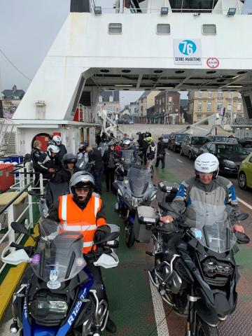 Le lendemain matin le ciel bleu et le soleil normand nous accueillent. Patrice et Babeth qui ont tracé et reconnu le parcours prennent la tête du convoi et nous redescendons par la vallée de la Seine jusqu'au bac de Duclair au travers d’épais bancs de brouillard.