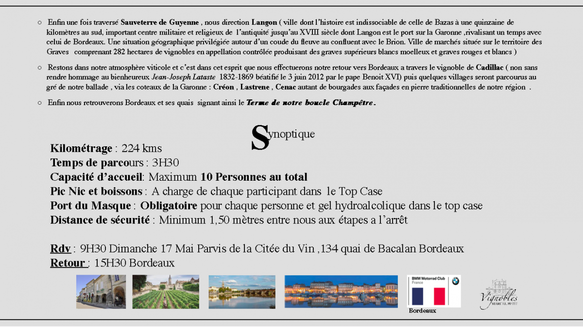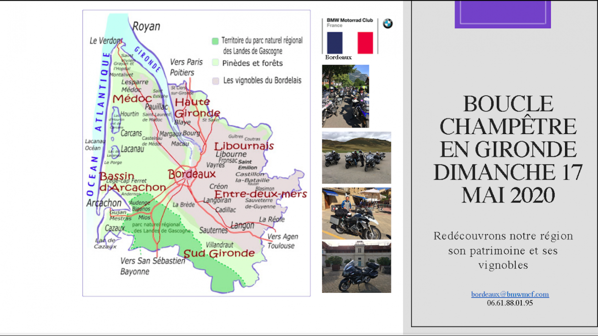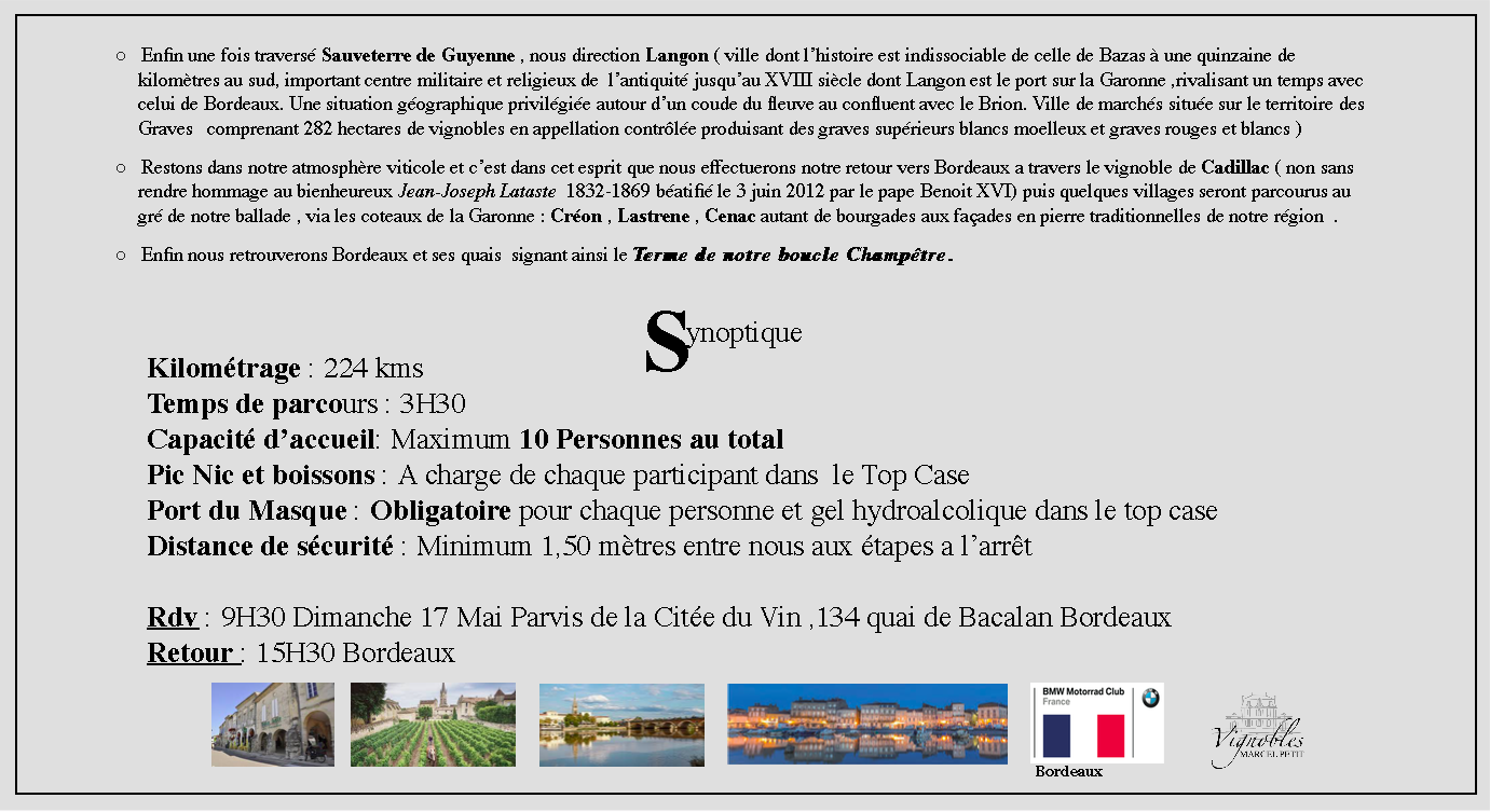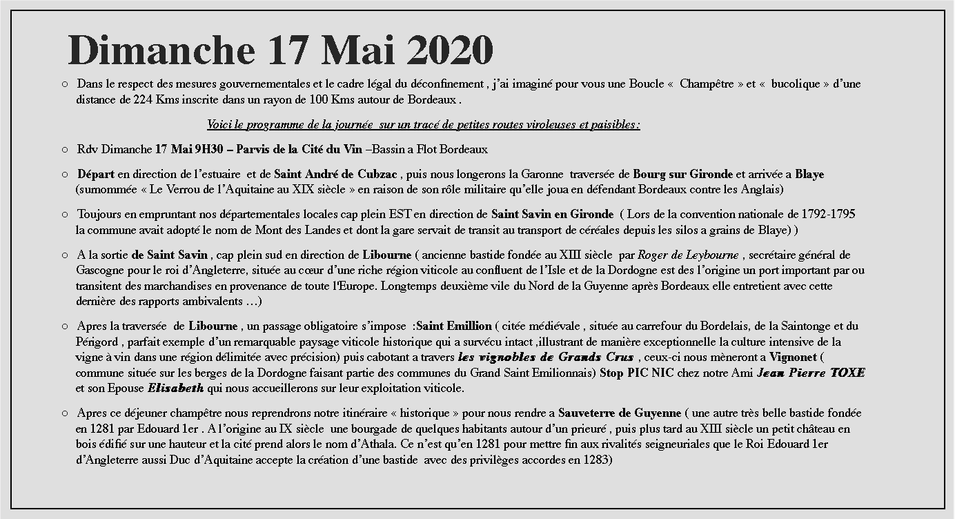 Nous avons pu à l’occasion du deconfinement organiser une BOUCLE CHAMPETRE dans le respect des 100 Kms autour de Bordeaux et sans quitter notre département.