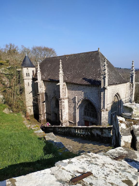 La chapelle Ste Barbe se niche en plein campagne, à flanc de falaise, sur la route de St Jacques de Compostelle. Michel s'improvise bedeau et rameute les fidèles en sonnant la cloche du campanile. Nous descendons, en procession, le majestueux escalier qui mène à la chapelle dont notre vénéré délégué s'est procuré la clé. Le site est magnifique, nous écoutons religieusement l'histoire romancée du lieu. Quelques pas autour de l'édifice pour admirer la construction et le paysage, et il faut reprendre la route. Petit arrêt devant les belles halles du Faouët et direction la chapelle St Fiacre, hélas fermée. Mais Michel, sans doute féru d'art religieux, nous vante la délicate musique de l'angélus. Il est pile midi, les cloches se mettent à sonner et ravissent nos oreilles.
