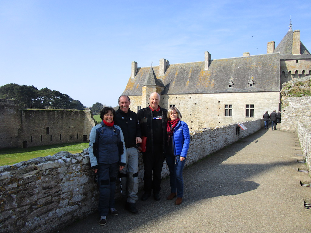 Dimanche, tôt levés, bonne humeur de rigueur, nous nous rendons dans la presqu'île du Rhuys, entre mer et marais salants. Pendant que nous admirons le château de Suscinio, résidence des ducs de Bretagne, Patrick nous régale de ses histoires truculentes, avec la verve qu'on lui connaît. La visite commence, le groupe suit la guide, écoute, pas toujours discipliné, la longue histoire du château. Longtemps laissé à l'état de ruines, ses pierres, cheminées ou bois de charpente pillés, le département du Morbihan a entrepris sa restauration dans les années 60. Nous arpentons les escaliers, salles et galeries, pour finir par les remparts qui surplombent un magnifique paysage.