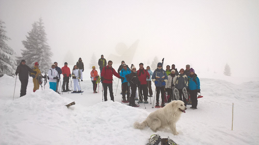 Notre équipe de 25 motards raquettes aux pieds et sa mascotte « Gotlib » à 4 pattes a parcouru tout le plateau avec une visibilité très réduite sans perdre personne (ce qui a été un exploit !)