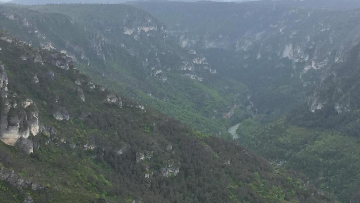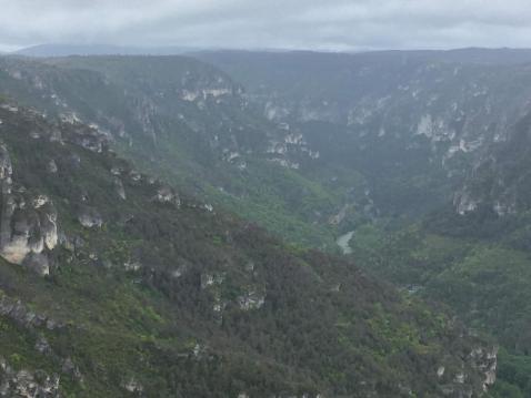 Découverte ensuite du « Point Sublime » qui malgré la brume laisse imaginer l’étendue, la profondeur, la grandeur de ces vallées. Endroit idéal pour pique-niquer ...par beau temps. Heureusement le petit restaurant local accepta de nous héberger pour ce pique-nique protégé de la pluie par...des parasols.