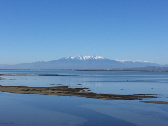 Puis nous avons longé le Lido de Leucate à St Cyprien : paysage lagunaire sur fond de Pyrénées aux cimes enneigées.