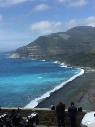Départ pour Saint-Florent, le « petit Saint Trop Corse » en longeant la mer, magnifiques dégrades de bleus, la plage vert de gris de Nonza due à l'ancienne usine désaffectée d'amiante.