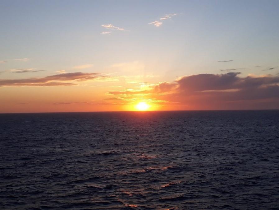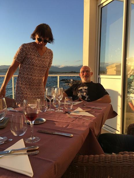 Repas sur la terrasse avec le coucher de soleil sur la baie.