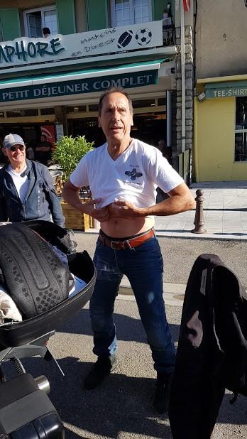 Halte à l’hôtel des Galets idéalement situé face à la mer pour un repos mérité avant la soirée au restaurant le Grill et découverte du Tee shirt de la sortie fièrement porté par notre chippendale Luc, un sacré flat twin qui a de la reprise....